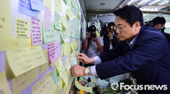 (서울=포커스뉴스) 정진석 새누리당 원내대표가 31일 오후 서울 광진구 지하철 구의역에서 스크린도어 정비 작업 중 사고로 숨진 김모(19) 씨의 추모공간을 방문해 고인을 추모하는 메모를 작성한 뒤 붙이고 있다.