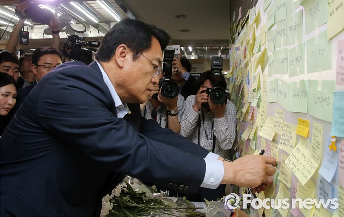 (서울=포커스뉴스) 정진석 새누리당 원내대표가 31일 오후 서울 광진구 지하철 구의역에서 스크린도어 정비 작업 중 사고로 숨진 김모(19) 씨의 추모공간을 방문해 고인을 추모하는 메모를 붙이고 있다.