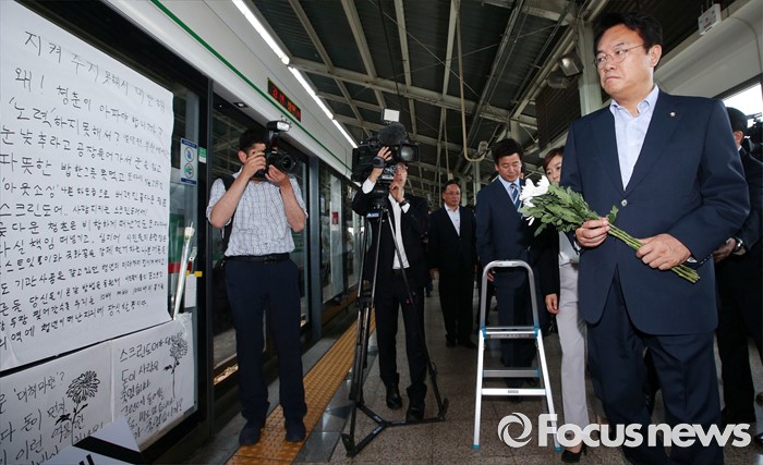 (서울=포커스뉴스) 정진석 새누리당 원내대표가 31일 서울지하철 2호선 구의역사를 방문 서울메트로 관계자를 만나 "(구의역 안전문 사고는) 인재의 성격을 띠는 사고다"며 "19살의 비정규직 청년의 죽음이 안타깝고 국민들을 슬프게 하고 있다"고 애도를 표했다.
