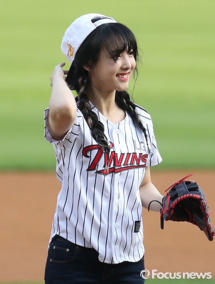 (서울=포커스뉴스) 31일 서울 잠실구장에서 열린 2016 프로야구 KIA-LG 경기에 앞서 걸그룹 트와이스의 나연이 시구를 마치고 관중에게 인사하고 있다.