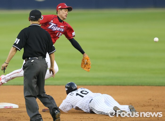 (서울=포커스뉴스) 31일 서울 잠실구장에서 열린 2016 프로야구 KIA-LG 경기 3회말 2사 1루에서 LG 1루주자 정주현이 이병규 타석때 2루 도루를 시도해 세이프되고 있다.