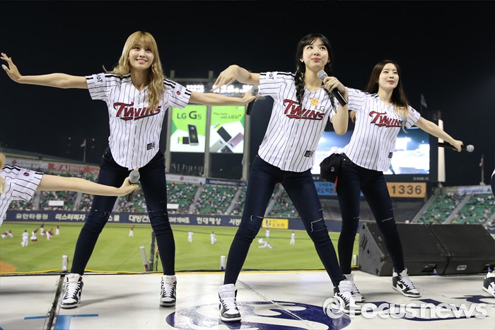 (서울=포커스뉴스) 31일 서울 잠실구장에서 열린 2016 프로야구 KIA-LG 경기에 인기 걸그룹 트와이스가 시구, 시타로 참여한뒤 경기 중간 응원단상에 올라 관중에게 노래와 춤을 선사하고 있다.
