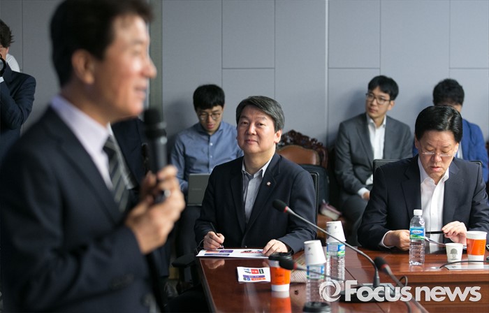 (서울=포커스뉴스) 안철수(가운데) 국민의당 상임공동대표 등 의원들이 1일 오전 서울 여의도 국회 의원회관에서 열린 9차 정책역량강화 워크숍에 참석해 이기정(왼쪽) 미양교등학교 교사의 발언을 듣고 있다.
