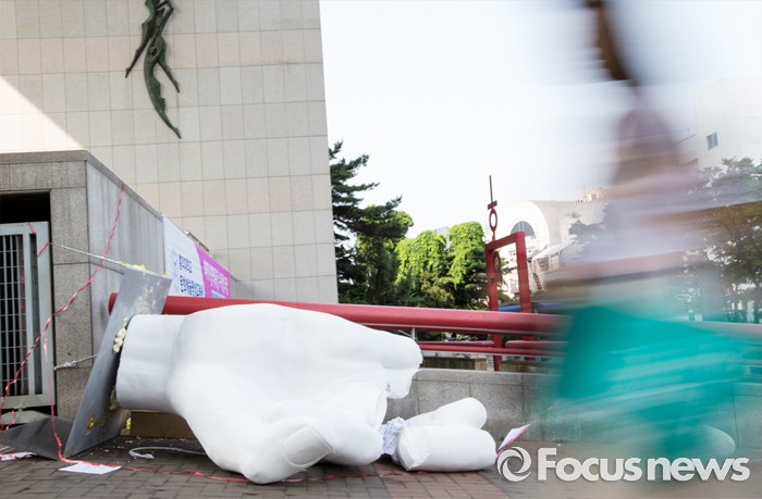 (서울=포커스뉴스) 1일 오전 서울 마포구 홍익대학교 정문에 설치된 극우성향 사이트 '일베' 상징물 조각상 파손된 채 길에 방치돼 있다. 조각상은 일간베스트저장소를 상징하는 자음 'ㅇ'과 'ㅂ' 모양을 하며 회원을 인증하는 손 모양이다. '어디에나 있고, 아무데도 없다'는 제목의 이 조각상은 조소과 4학년 홍기하씨가 '환경조각연구' 수업 과제로 제작해 야외조각전에 출품한 것이다.