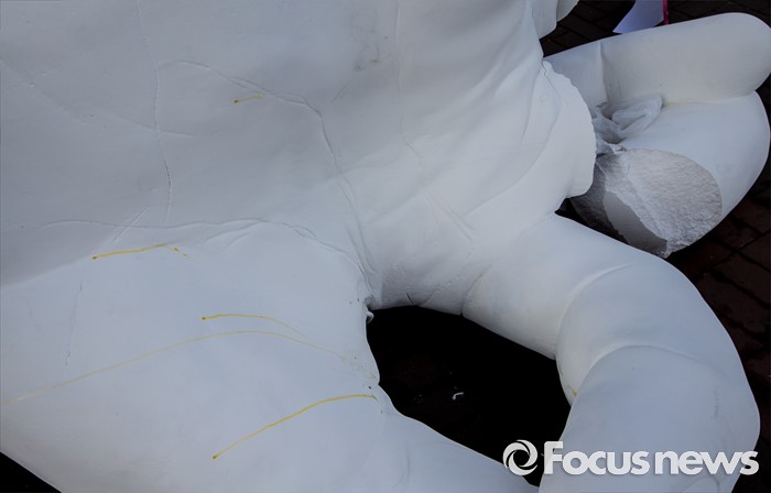 (서울=포커스뉴스) 1일 오전 서울 마포구 홍익대학교 정문에 설치된 극우성향 사이트 '일베' 상징물 조각상 파손된 채 길에 방치돼 있다. 조각상은 일간베스트저장소를 상징하는 자음 'ㅇ'과 'ㅂ' 모양을 하며 회원을 인증하는 손 모양이다. '어디에나 있고, 아무데도 없다'는 제목의 이 조각상은 조소과 4학년 홍기하씨가 '환경조각연구' 수업 과제로 제작해 야외조각전에 출품한 것이다.