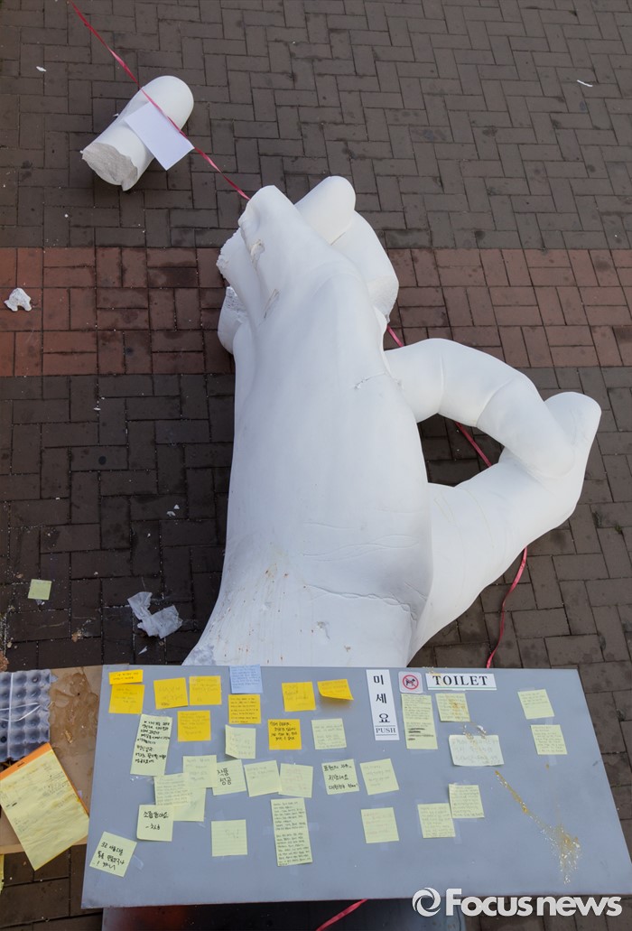 (서울=포커스뉴스) 1일 오전 서울 마포구 홍익대학교 정문에 설치된 극우성향 사이트 '일베' 상징물 조각상 파손된 채 길에 방치돼 있다. 조각상은 일간베스트저장소를 상징하는 자음 'ㅇ'과 'ㅂ' 모양을 하며 회원을 인증하는 손 모양이다. '어디에나 있고, 아무데도 없다'는 제목의 이 조각상은 조소과 4학년 홍기하씨가 '환경조각연구' 수업 과제로 제작해 야외조각전에 출품한 것이다.