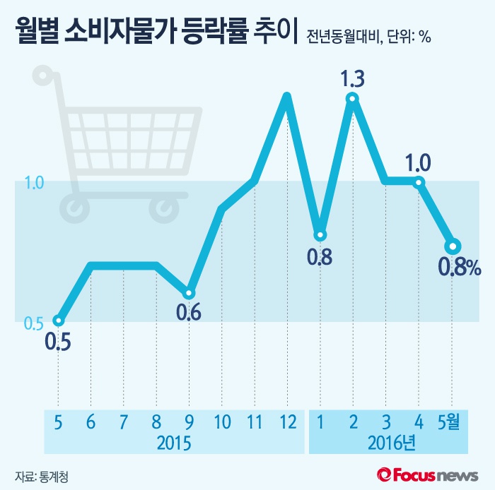 (서울=포커스뉴스) 1일 통계청이 발표한 소비자물가동향에 따르면 5월 소비자물가는 전년 동월 대비 0.8% 상승했다. 소비자물가상승률이 4개월 만에 0%대로 내려갔다.