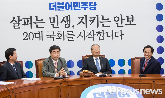 (서울=포커스뉴스) 우상호 더불어민주당 원내대표가 1일 오전 서울 여의도 국회에서 열린 비상대책위원회 회의에서비상대책위원들과 함께 20대 국회 개원에 발 맞춰 만든 배경판을 바라 본 후 환하게 웃고 있다. 회의실 배경판에는 '살피는 민생, 지키는 안보 20대 국회를 시작합니다'라는 글이 새겨져 있다.