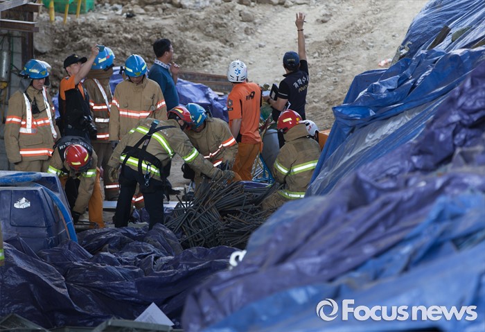 (남양주=포커스뉴스) 1일 오전 7시 20분께 경기 남양주시 진전읍 금곡리 진접석 지하철 공사현장이 붕괴되는 사고가 발생해 소방대원들이 구조작업을 하고 있다.