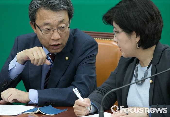 (서울=포커스뉴스) 1일 오전 서울 여의도 국회에서 열린 국민의당 최고위원회의에 참석한 김성식(왼쪽) 정책위의장과 박주현 최고위원이 대화하고 있다.