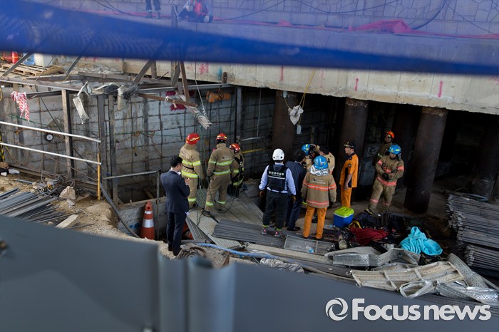 (남양주=포커스뉴스) 1일 오전 7시 20분께 경기 남양주시 진전읍 금곡리 진접석 지하철 공사현장이 붕괴되는 사고가 발생해 소방대원들이 구조작업을 하고 있다.