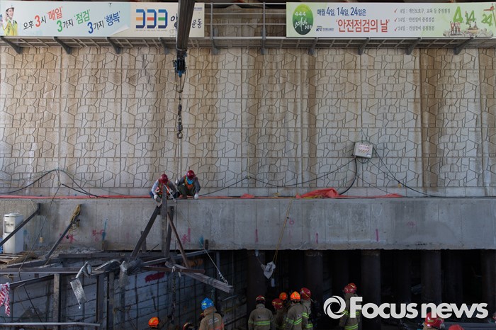 (남양주=포커스뉴스) 1일 오전 7시 20분께 경기 남양주시 진전읍 금곡리 진접석 지하철 공사현장이 붕괴되는 사고가 발생해 소방대원들과 인부들이 구조작업을 하고 있다.