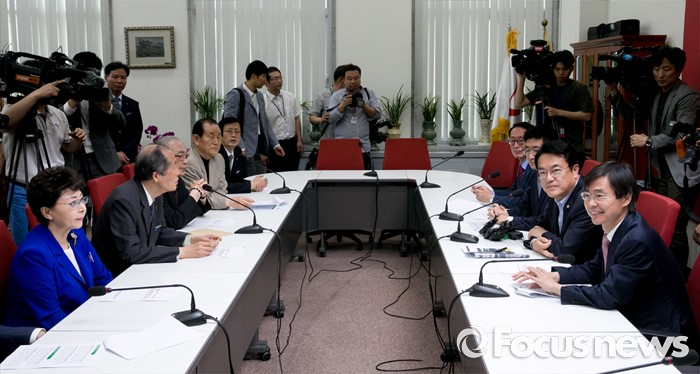 (서울=포커스뉴스) 정진석 새누리당 원내대표와 의원들이 1일 오전 서울 여의도 국회에서 김해공항가덕이전시민추진단과 면담을 하고 있다.