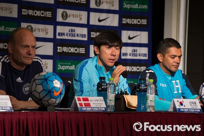 (인천=포커스뉴스) 1일 오전 인천 연수구 라마다송도호텔에서 열린 4개국 올림픽 국가대표 축구대회 공식 기자회견에서 신태용 대한민국 감독이 질문에 답하고 있다. 왼쪽부터 닐스 프레드닉센 덴마크 감독, 신 감독, 아마도 궤바라 온두라스 수석코치.