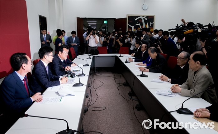 (서울=포커스뉴스) 정진석 새누리당 원내대표와 의원들이 1일 오전 서울 여의도 국회에서 김해공항가덕이전시민추진단과 면담을 하고 있다.