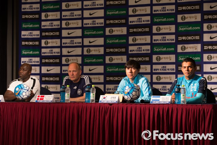 (인천=포커스뉴스) 1일 오전 인천 연수구 라마다송도호텔에서 열린 4개국 올림픽 국가대표 축구대회 공식 기자회견에서 참가국 감독과 수석코치가 취재진 질문에 답하고 있다. 왼쪽부터 삼손 시아시아 나이지리아 감독, 닐스 프레드닉센 덴마크 감독, 신태용 대한민국 감독, 아마도 궤바라 온두라스 수석코치.