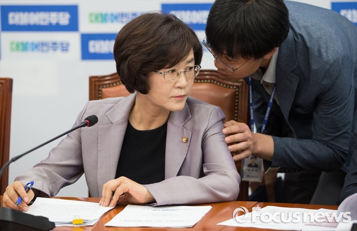 (서울=포커스뉴스) 김상희(왼쪽) 더불어민주당 서민 주거 TF 단장이 1일 오전 국회 원내대표실에서 열린 서민주거TF 발족식에서 당직자와 대화하고 있다.
