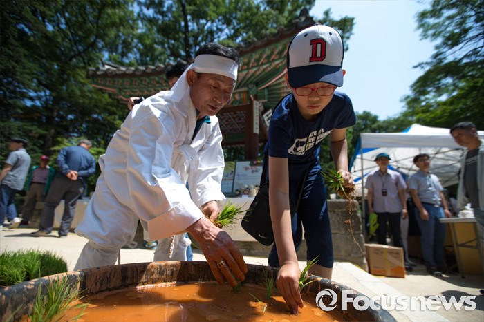 (서울=포커스뉴스) 1일 오전 서울 종로구 창덕궁 내 옥류천 청의정에서 손 모내기 행사가 열리고 있다. 손 모내기 행사는 조선시대 임금이 궁궐 안에 경작지를 조성, 그 해 농사의 풍년과 흉년을 예상해보기 위해 시행했던 친경례(親耕禮) 의식의 의미를 되살린 것이다.