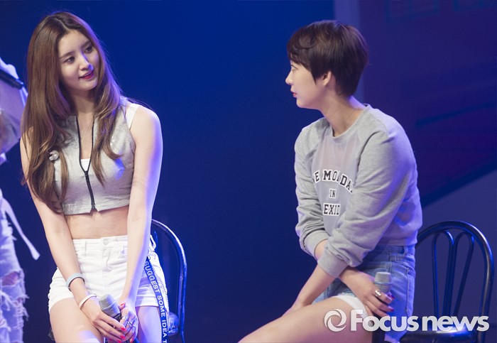 (서울=포커스뉴스) 1일 오전 서울 강남구 일지아트홀에서 열린 걸그룹 EXID의 정규 1집앨범 'STREET' 발표 쇼케이스에 참석한 멤버 정화(왼쪽)와 혜린이 무대를 선보이고 있다.