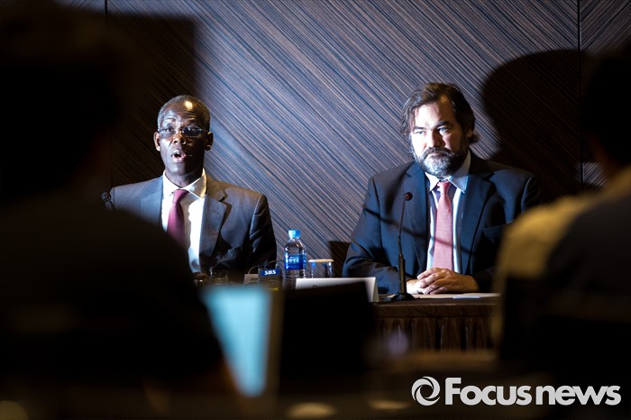 (서울=포커스뉴스) 1일 오후 서울 중구 플라자호텔에서 열린 '유엔인권이사회, 기업과인권 한국조사단 기자회견'에서 마이클(왼쪽) 아도 의원이 한국 기업 인권 조사 결과 발표를 하고 있다.
