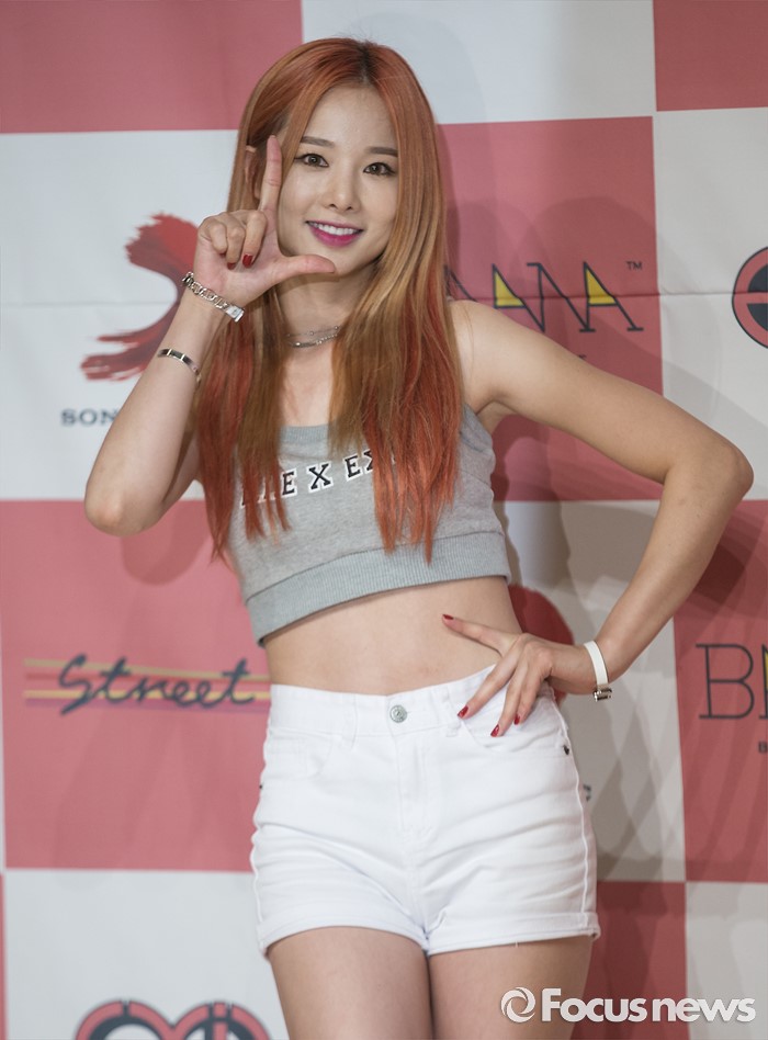 (서울=포커스뉴스) 1일 오전 서울 강남구 일지아트홀에서 열린 걸그룹 EXID의 정규 1집앨범 'STREET' 발표 쇼케이스에 참석한 멤버 멤버 솔지가 포토타임을 갖고 있다.
