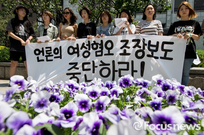 (서울=포커스뉴스) 1일 오전 서울 중구 프레스센터 앞에서 '언론의 여성혐오 조장 보도실태'에 반대하는 20대 여성들이 '우리는 기자회견女다' 기자회견을 갖고 있다.