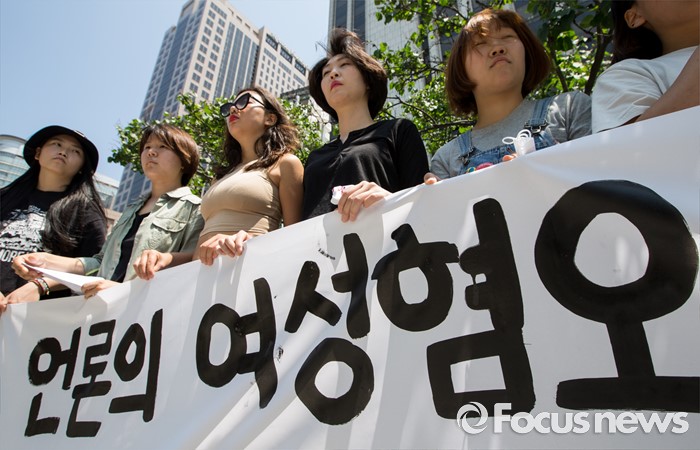 (서울=포커스뉴스) 1일 오전 서울 중구 프레스센터 앞에서 '언론의 여성혐오 조장 보도실태'에 반대하는 20대 여성들이 '우리는 기자회견女다' 기자회견을 갖고 있다.