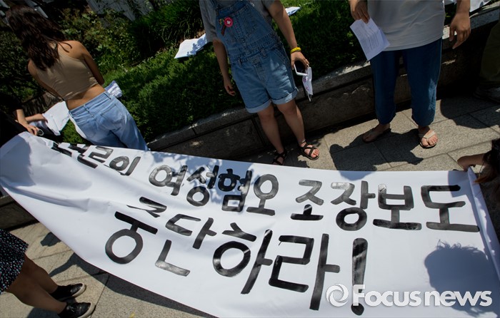 (서울=포커스뉴스) 1일 오전 서울 중구 프레스센터 앞에서 '언론의 여성혐오 조장 보도실태'에 반대하는 20대 여성들이 '우리는 기자회견女다' 기자회견을 갖고 있다.
