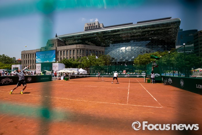 (서울=포커스뉴스) 이형택 전 테니스 국가대표가 1일 오후 서울 중구 서울광장에서 열린 '롤랑가로스(프랑스오픈) 인더시티'에서 대학생들과 스페셜 매치 시합을 하고 있다.