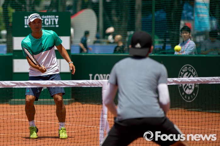 (서울=포커스뉴스) 이형택 전 테니스 국가대표가 1일 오후 서울 중구 서울광장에서 열린 '롤랑가로스(프랑스오픈) 인더시티'에서 대학생들과 스페셜 매치 시합을 하고 있다.