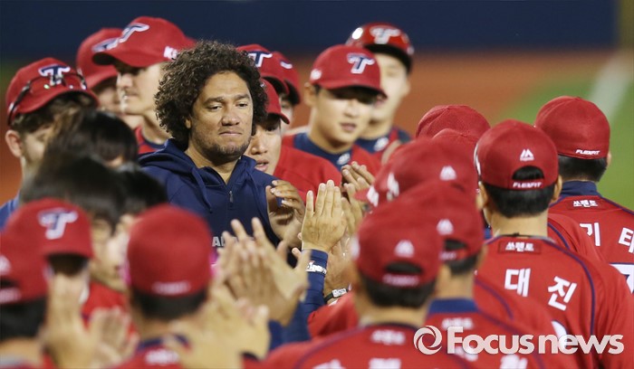 (서울=포커스뉴스) 1일 서울 잠실구장에서 열린 2016 프로야구 KIA-LG 경기에서 승리한 KIA 선수들이 코칭스탭과 하이파이브를 하고 있다. 투수 헥터는 7이닝 무실점으로 승리의 일등공신이 됐다.