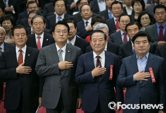 (서울=포커스뉴스) 2일 오후 서울 여의도 국회 의원회관에서 열린 새누리당 4차 전국위원회에 참석한 홍문표(앞줄 왼쪽부터) 사무총장 대행, 정진석 원내대표, 서청원 전 최고위원, 원유철 전 원내대표 등 전국위원들이 국기에 대한 경례를 하고 있다.