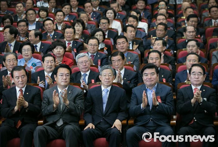 (서울=포커스뉴스) 2일 오후 서울 여의도 국회 의원회관에서 열린 새누리당 4차 전국위원회에 참석한 정진석(앞줄 왼쪽 두번째) 원내대표 등 전국위원들이 김희옥(오른쪽 세번째) 혁신비대위원장의 공식 선출을 박수로 의결하고 있다.
