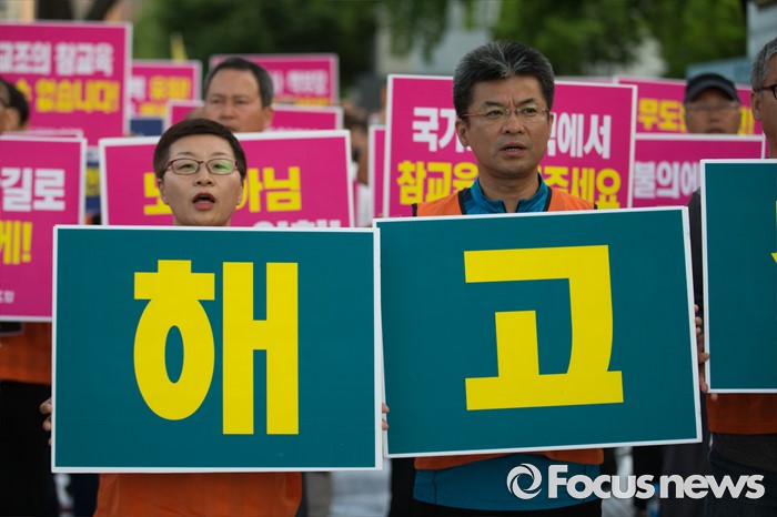 (서울=포커스뉴스) 전국교직원노동조합 조합원들이 1일 오후 서울 종로구 정부서울청사 앞에서 열린 '법외노조 탄압, 부당해고 규탄 48시간 집중행동 투쟁문화재'에서 부당해고 중단을 촉구하는 구호를 외치고 있다.