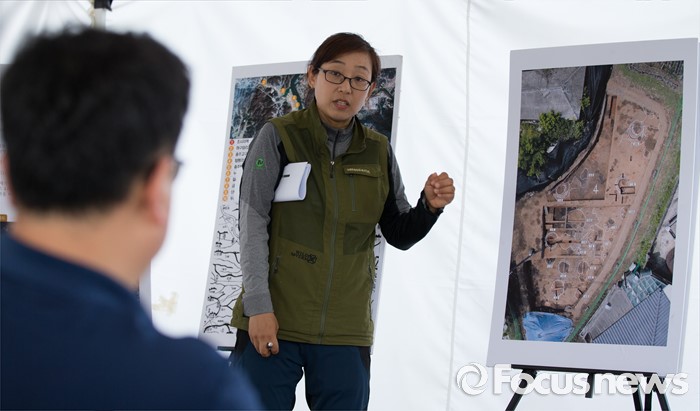 (충주=포커스뉴스) 충북 충주 칠금동 392-5번지 일대에서 백제 제철유적이 발견된 가운데 2일 현장에서 발굴조사 현장설명회가 열렸다. 발굴책임자인 한지선 국립중원문화재연구소 학예연구사가 제철유적에 대한 설명을 하고 있다.