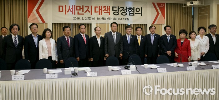 (서울=포커스뉴스) 2일 오전 서울 여의도 국회 귀빈식당에서 열린 미세먼지 대책 관련 당정협의에 참석한 의원들과 장, 차관들이 취재진을 향해 포즈를 취하고 있다. 왼쪽부터 정기석 질병관리본부장, 이관섭 산업통상자원부 1차관, 전희경, 이현재, 이명수 의원, 윤성규 환경부 장관, 정진석 원내대표, 최양희 미래창조과학부 장관, 김광림 정책위의장, 이석준 국무조정실장, 김상훈, 박인숙, 김정재, 김승희 의원, 최상목 기획재정부 1차관.