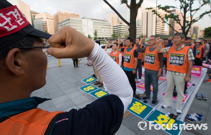(서울=포커스뉴스) 전국교직원노동조합 조합원들이 1일 오후 서울 종로구 정부서울청사 앞에서 열린 '법외노조 탄압, 부당해고 규탄 48시간 집중행동 투쟁문화재'에서 부당해고 중단을 촉구하는 구호를 외치고 있다.