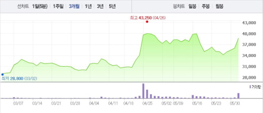 주가는 장 초반 3만9950원까지 올라갔다가 10시에 3만8100원까지 떨어지면서 잠시 하락세를 보였다. 이후 주가는 회복, 3만8000원대 후반에서 3만9000원 사이를 오르 내리며 상승세를 유지했다.