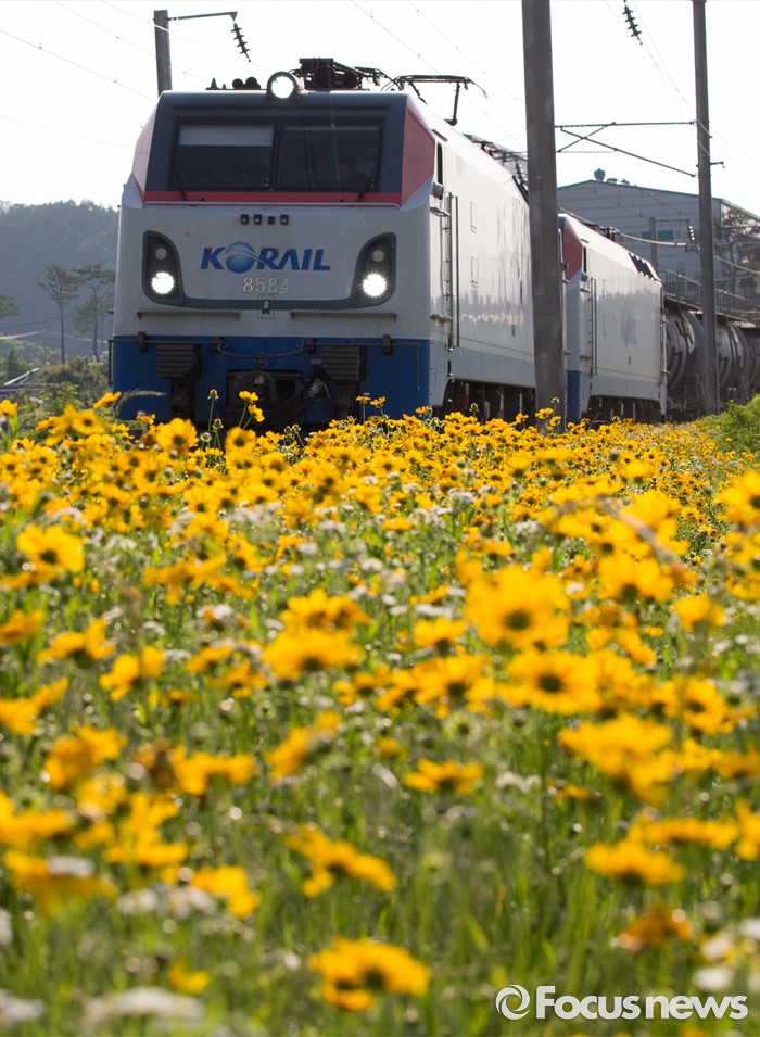 (충주=포커스뉴스) 2일 오후 충북 충주시 장성리에서 금계국 사이로 열차가 지나고 있다.