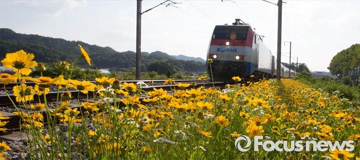 (충주=포커스뉴스) 2일 오후 충북 충주시 장성리에서 금계국 사이로 열차가 지나고 있다.