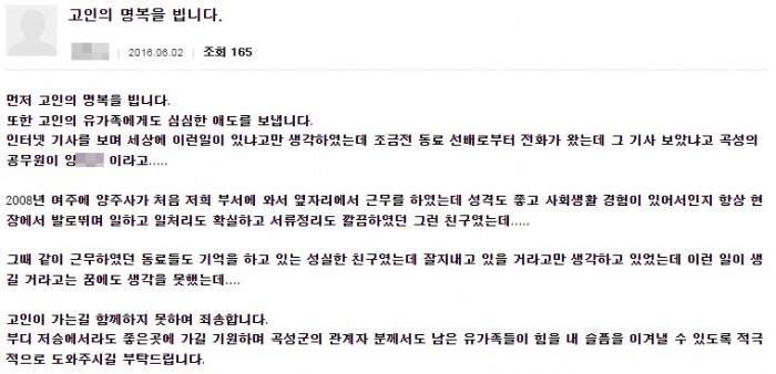 곡성군청 홈페이지에는 양씨의 옛 동료가 추모의 글을 남기기도 했다.