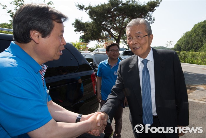 (괴산=포커스뉴스) 김종인 더불어민주당 비대위 대표가 1일 오후 충북 괴산 성불산자연휴양림에서 열린 충북도당 핵심당직자 워크숍에 참석, 도종환 도당위원장과 악수를 하고 있다.