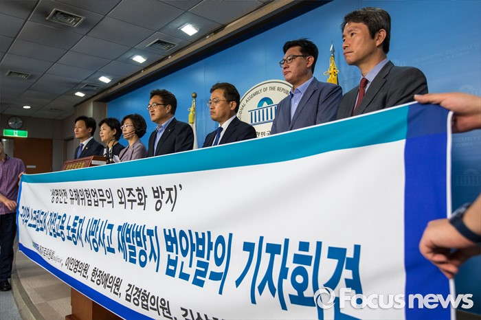 (서울=포커스뉴스) 우원식 더불어민주당 을지로위원회 위원장을 비롯한 소속 의원들이 2일 오후 서울 여의도 국회에서 구의역 스크린도어 간접고용 노동자 사망사고 재발방지 법안발의 관련 기자회견을 하고 있다.