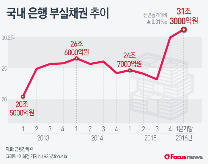 (서울=포커스뉴스) 2일 금융감독원이 발표한 '1분기말 국내은행의 부실채권 현황(잠정)'을 보면에 따르면 부실채권 규모는 31조3000억원으로 전년동기대비 0.31%p 증가했다.