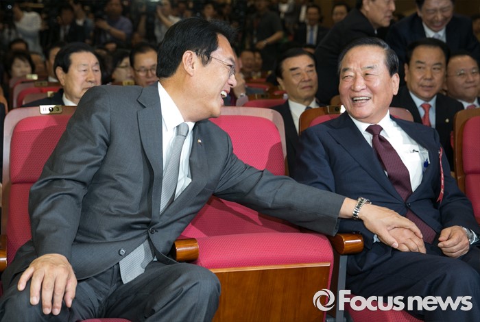 (서울=포커스뉴스) 2일 오후 서울 여의도 국회 의원회관에서 열린 새누리당 4차 전국위원회에 참석한 정진석(왼쪽) 원내대표와 서청원 전 최고위원이 대화하고 있다.