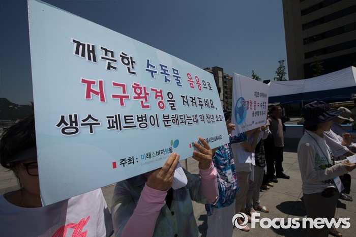 (서울=포커스뉴스) 2일 오전 서울 종로구 광화문 광장에서 수돗물 시민네트워크 관계자들이 수돗물 불신조장감시센터 방송 모니터링단 발대식을 열고 있다.