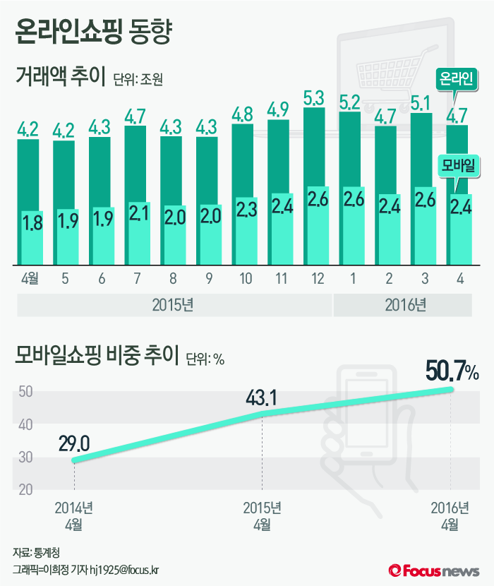 (서울=포커스뉴스) 2일 통계청이 공개한 ‘2016년 4월 온라인쇼핑 동향’에 따르면 올 4월 온라인쇼핑 거래액은 4조 7602억 원으로 이 중 모바일쇼핑 거래액은 2조4115억 원으로 비중은 50.7%를 차지했다.