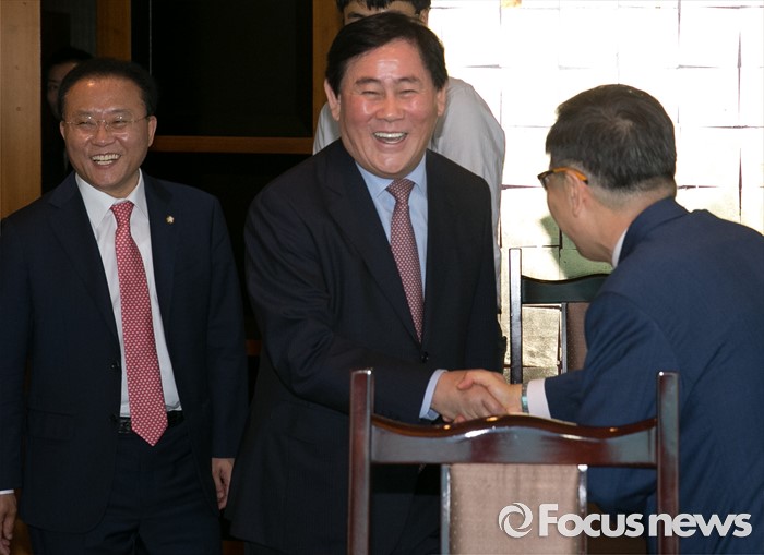 (서울=포커스뉴스) 최경환(가운데) 새누리당 의원이 2일 오후 서울 여의도 한 중식당에서 열린 20대 총선 대구지역 당선 의원들과의 오찬에 참석해 의원들과 인사하고 있다. 이날 오찬에는 곽대훈, 곽상도, 윤재옥, 정태옥, 추경호 의원 등이 참석했다.