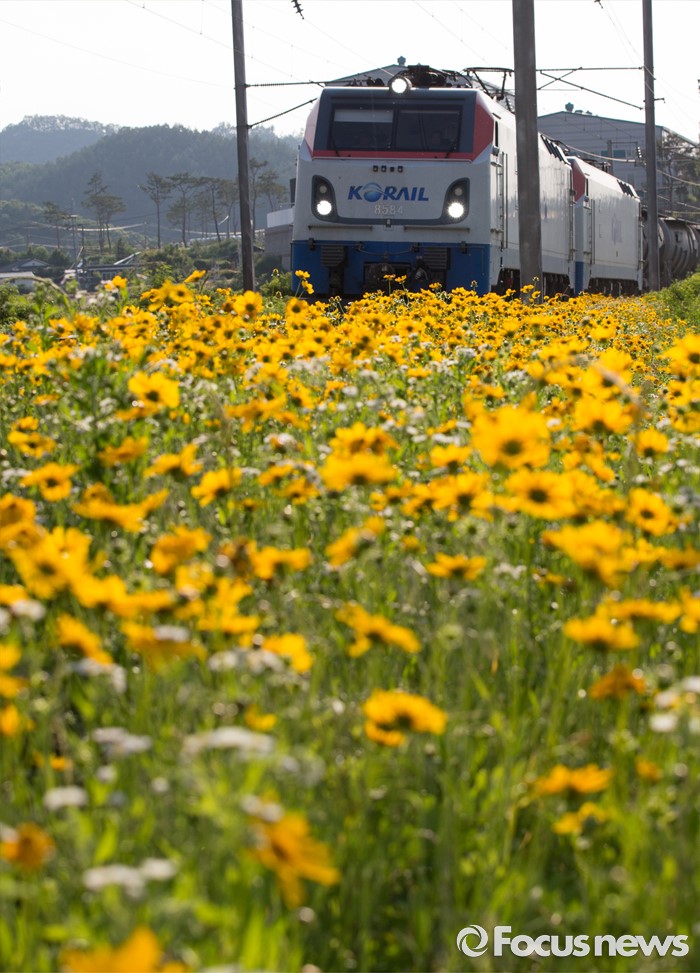 (충주=포커스뉴스) 2일 오후 충북 충주시 장성리에서 금계국 사이로 열차가 지나고 있다.