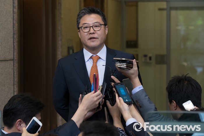 (서울=포커스뉴스)김정범 현대상선 비상경영실장이 2일 오후 서울 종로구 현대상선 본사에서 열린 'G6' 해운동맹 회원사 협렵방안 회의가 끝난 뒤 결과를 설명하고 있다.